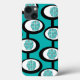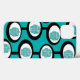 Este estuche de teléfono tiene un diseño moderno de mediados de siglo de líneas que hacen que los círculos dentro de óvalos se unan en turquesa, negro y blanco.