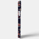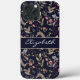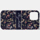 Funda para iPhone 13 Pro Max del patrón botánico de la Marina Blue Woodland. Este diseño presenta un patrón de conejo de bosque de bosques naturales, pájaro, floral rosa y hojas sobre un fondo azul marino oscuro. Personalízalo con tu nombre.