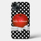 Linda funda para iPhone con gráficos de un pequeño patrón de flores en rojo jugoso, sobre un fondo de lunares en blanco y negro. Los gráficos de una cinta blanca y un lazo cruzan la parte inferior de la manzana. Personaliza el texto blanco. Ideal para ti o como regalo para tu maestro favorito.
