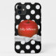 funda bonito iPhone 5 con gráficos de un pequeño patrón de flores en rojo jugoso, contra un fondo de puntos polka negro y blanco. Los gráficos de una cinta blanca y un arco recorren la parte inferior de la manzana. Personalice el texto en blanco. Ideal para ti o como una idea de regalo para tu profesor favorito.