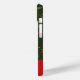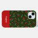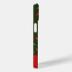 Una maleta telefónica con un patrón de bayas de goji sobre un fondo verde oscuro y un nombre de personalizable en la parte inferior sobre un fondo rojo. Un regalo encantador para un amigo que ama las bayas.