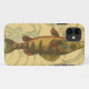 Esta impresión ilustra una imagen artística de un pez perca amarillo. El fondo muestra un mapa geográfico vintage en tonos beige claro. El marco marrón se asemeja al antiguo patrón de madera con flores amarillas-rojas en los bordes. ¡Una gran adición a tu colección de pesca!