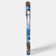 Perro alegre de estilo caricaturesco. El perro lleva un sombrero rojo de Santa y una bufanda roja a juego, lo que le da una apariencia festiva. El fondo está adornado con copos de nieve azules y piñas, lo que contribuye a un tema invernal o navideño. El ambiente general del diseño es juguetón y alegre, lo que lo hace adecuado para la temporada navideña.