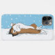 Estuche para iPhone de Sheltie Lover. Dibujo de un perro pastor Shetland rodando en la nieve con copos de nieve cayendo. Visita el mundo doodle de Jenn para ver más productos con este diseño de perro feliz y muchos regalos de vacaciones de raza de perro.