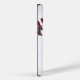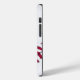 Estuche para iPhone de béisbol personalizado, con gráficos de la costura de estilo rojo de un béisbol, en la esquina superior izquierda y en la esquina inferior derecha del funda blanco. Personalice el texto negro para que se ajuste a sus necesidades.