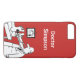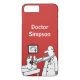 Añade tu elección de nombre. Médica está usando su estetoscopio en los pies de un paciente. Personalizado gracioso de fondo rojo. Estuche de teléfono para un médica, médico o médico general