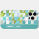 Elegante y elegante moda blanco, gris, verde limón, azul verde azulado y azul turquesa acuático cuadrado y triángulos de diseño de patrón de polígono. Con espacio para personalizar o personalización con un nombre, monograma o iniciales de su elección. Hermosa, moderna y fresca cubierta para la moda y amante del arte, amante de las caderas, amante del arte y amante del humor que quiere proteger su teléfono del polvo y la suciedad, el desgaste y el desgaste. Este diseño está disponible en los fundas Apple iPhone 6, 7 y 8 Plus, 10 o X, XR, XS, 11, 12, 13 Mini, 14, 15 Plus y Pro Max. Muestra tu estilo, luce a la moda y te sientes elegante con un diseño único en un accesorio para equipos móviles de tu elección.