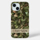 Customize this pine and leaves camouflage iPhone 15 case with your name in a trendy modern CAP font in brown on opaque cream. It's masculine and perfect for your favorite military, hunting, country or outdoorsman!