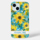 Personaliza esta moderna y colorida pintura de girasoles sobre funda para iPhone 15 con tu nombre en una fuente mayúscula moderna y elegante en azul turquesa sobre blanco. ¡Es tan hermosa y alegre!