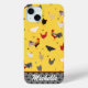 Este divertido estuche de teléfono de pollo tiene un estilo Memphis con un tema de granja de pollos. En el diseño se utilizan patrones geométricos modernos para colorear gallos y pollos en un pastor con fondo de alambre de pollo amarillo. Hay dos grandes gallos y diez gallinas encantadoras en este patrón. Un divertido patrón de pollo actualizado para un estilo de país moderno. Perfecto para cualquiera que esté loco por el pollo. Puede hacer que el patrón sea más grande o más pequeño en este estuche de teléfono. Personalice al funda con su nombre. Esto es un gran regalo para cualquiera que ame los pollos y el diseño moderno.