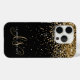 Estuche Glam Gold Purpurina Elegant Monograma para iPhone. Personaliza fácilmente este diseño de moda de estuche de teléfono de moda con un elegante purpurina brillante de oro sobre un fondo negro. El diseño incluye su monograma manuscrito con giros de bonito y nombre.
