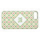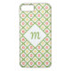 Un patrón de quatrefoil giratorio Barely There iPhone 7 Funda en verde verde y blanco y decorado con adorables flores de margarita amarillas y naranjas retro. Personalice a la chica especial en su vida añadiendo su primer monogramado a la placa con forma de diamante.