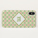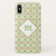 Un patrón de quatrefoil giratorio Barely There iPhone x Funda en verde verde y blanco y decorado con adorables flores de margarita amarillas y naranjas retro. Personalice a la chica especial en su vida añadiendo su primer monogramado a la placa en forma de diamante.