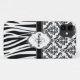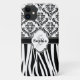 Patrón clásico y elegante de damasco blanco y negro con rayas de cebra. El diseño gráfico presenta una placa de nombre de estilo retro con letra inicial monogramo y nombre. Elegante regalo de moda de moda para niñas y mujeres.
