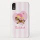Un diseño lindo para la chica joven (o los jóvenes en la mujer del corazón) que ama el montar a caballo. Un chica lindo que monta un caballo en un corazón rosado del amor con las rayas rosas claras y blancas en el fondo. Personalizar con su propio texto para crear un caso único.