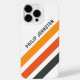 estuche para iPhone con tres rayas diagonales en gris oscuro y dos sombras de naranja en fondo blanco y tu nombre personalizado en un tipo de letra negrita y moderna sans serif.