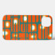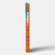 Este estuche de teléfono tiene un diseño moderno de mediados de siglo de rectángulos naranjas con círculos blancos y dorados en ellos y líneas horizontales verde azuladas que los atraviesan en un campo de verde azulado.