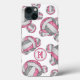 Este estuche para iPhone duro con temas de voleibol para chicas presenta balones de voleibol de tamaño variado rosa, gris y blanco dispuestos en un patrón aleatorio sobre un fondo blanco personalizable — los paneles de voleibol rosa y gris se mezclan con un patrón kaleidoscópico floral para una apariencia femenina y femenina que sigue siendo deportiva - personalizar su monograma, carta de varsity o número jersey sobre voleibol blanco - por katz_d_zynes