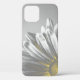 Proteja su smartphone con un estuche para teléfonos celulares amarillo y gris con luces florales y bonitos. Esta cubierta personalizado florida presenta una fotografía floral blanca y negra realzada digitalmente de pétalos de flores de margarita con un tono amarillo añadido y un fondo gris plateado.