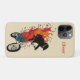 A dynamic illustration of a motorcyclist in motion, surrounded by flowing bursts of red, orange, and blue energy. The artwork captures the thrill and intensity of speed, blending realism with abstract fire-like shapes for a powerful visual impact. Ideal for motorcycle enthusiasts and lovers of bold, energetic art.