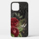 Elegante estuche de teléfono de inspiración gótica hecho en un patrón damasco negro, sobre el fondo y gráficos de rosas rojas con flores verdes y negras. Personalizar para agregar un nombre a esta elegante estuche telefónica.