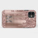 Moderno, muchacha rosa de oro purpurina gotea nombre y estuche de iphone monogramado. Este diseño presenta goteos de brillo de purpurina de color rosa rosa rosa rosado sobre fondo metalizado cepillado rosa con plantilla de texto de monograma inicial y de primer nombre personalizada personalizado. Un regalo femenino perfecto. Si necesitas ayuda o elementos coincidentes, por favor contacta conmigo.
