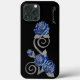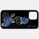 Elegante estuche para iPhone negro, con gráficos de rosas metálicos de tono azul y plateado. Personaliza el texto gris para ti mismo o como una encantadora para ella.