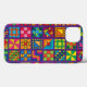 Estuche de teléfono móvil animado y colorido que contiene bloques de edredones tradicionales dibujados a mano en colores alegres y alegres.