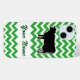 Este elegante estuche de teléfono blanco y verde presenta la silueta negra de una vaca moo. El fondo presenta un patrón de chevron de zig-zag verde y blanco que se repite con espacio para agregar su propio nombre o mensaje corto en un tipo de letra de guión verde! ¡Abra el editor completo para cambiar el color del chevron!