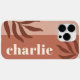 Estuche de teléfono moderno con tu nombre personalizado alineado verticalmente a la derecha en un fondo marrón de terracota y hojas de terracota más oscuras.