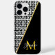Línea diagonal de efecto fotográfico de Relieve metalizado metálico de oro con un patrón geométrico de clave griega clásico por un lado y un diseño monogramado de personalizable sobre negro sólido por el otro. Crea tu propio funda de monograma personalizado. Pruebe una fuente o color diferente en el sistema para que se adapte a su estilo personal.