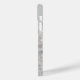 estuche para iPhone con mi sutil y bonito diseño vectorial de tres mariposas blancas y negras volando sobre burbujas ventiladas de gris y blanco con toques de melocotón, sobre un fondo gris.