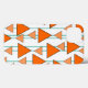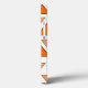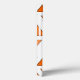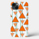 Este estuche de teléfono tiene un diseño art deco de triángulos colgados en líneas verde azuladas en dos tonos de naranja.