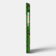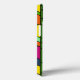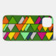 Este estuche de teléfono tiene un diseño moderno de mediados de siglo de triángulos superpuestos en colores floridos que corren verticalmente sobre un campo de verde.