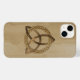 Un Funda para iPhone 14 Plus con un triquetra celta de color sencillo, entrelazado con un círculo que forma un símbolo trinitario sobre un fondo maderero, representando la unidad espiritual con lo divino.