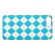 Diseño de un patrón de argyle azul turquesa y blanco en un estuche de teléfono.