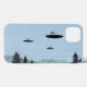 Una acuarela, pluma y tinta, y un dibujo a lápiz de color de tres OVNIs de platillo sobre las montañas.