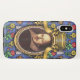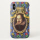 The Bard - La obra de arte original de ZoeSPEAK en este Funda de iPhone X es un retrato del autor William Shakespeare. El retrato está en un marco dorado oval ornamentado con cintas y una corona encima. El fondo azul de la pared está decorado con castillos, coronas de reyes y flores amarillas y rojas, recordando el romance, la tragedia y la comedia de sus obras y poesía.
