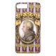Las ilustraciones y diseño originales de ZoeSPEAK en esta funda para iPhone 8/7 Plus presentan un retrato del compositor de música clásica Wolfgang Amadeus Mozart. El retrato es un perfil enmarcado en un ornado marco ovalado dorado. El marco cuelga sobre un fondo de papel tapiz púrpura con racimos dorados de uvas en filas y franjas verticales blancas y lavanda.