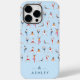 Ilustracion colorido de personas con diferentes poses de yoga sobre un fondo azul claro. Yoga posiciona el nombre personalizado del estuche para iPhone. El yoga representa la meditación del estuche para iPhone. Estuche para iPhone de yoga azul claro personalizable. Patrón de yoga azul personalizado con tu nombre. Estuche lindo, divertido, personalizado, azul para iPhone. Chicas lindo estuche para iPhone de yoga con nombre personalizado e inicial.