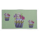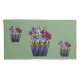 A trio of IconDoIt's original "Arts and Crafts" style inspired design of a calla lily emblazoned cornflower blue vase filled with a mixed floral bouquet of violet pansies and daisies set against a celadon green raw silk look background.