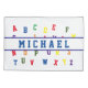 El diseño alfabético personalizado de los niños presenta un fondo blanco para el alfabeto con letras de esténcil coloridas y brillantes. El nombre del niño se muestra en azul. También disponible en rojo. Diseñado para coordinar con la "colección ABC Baby Shower y Nursery".