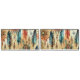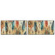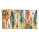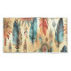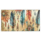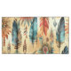 Azteca boho nativa acuarela de Estados Unidos diseño tribal de plumas azul turquesa, girasoles rojos abstractos y formas geométricas sobre un fondo de arena desértica.