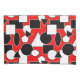 Esta funda tiene un diseño Bauhaus de triángulos, círculos, rectángulos y pentagones en blanco y negro sobre un campo de rojo.