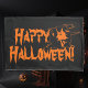 Caja negra y anaranjada del feliz Halloween de la almohada. Decoración casera asustadiza para el dormitorio. Luna Llena con la bruja en una escoba, un gato negro y palos. Accesorios, decoraciones y fuentes del fiesta de la diversión.