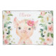 Este funda de almohada Personalizado coordina con los demás diseños de la Colección Olivia Pigsley y puede ser personalizado con el nombre de su bebé. El diseño de la manta incluye un cerdo adorable con un rosa en la oreja, rodeado de rosas blancas y rosas negras sobre un fondo blanco brillante. La espalda tiene rayas rosas.