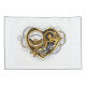 Corazón mecánico, volumétrico, de vapor punk con manómetro de presión, acero y engranajes dorados sobre fondo blanco. Estilo Steampunk.
