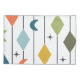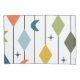 Esta funda de almohada tiene un diseño moderno de mediados de siglo de líneas verticales con diamantes y boomerangs, con starburst esparcidas en el fondo.