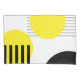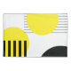 Ilustracion de diseño abstracto con formas geométricas (círculos y rayas) en tonos amarillos y negros sobre fondo blanco.