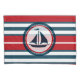 Diseño náutico con decoración de velero en forma redonda sobre fondo rayado rojo, azul y blanco